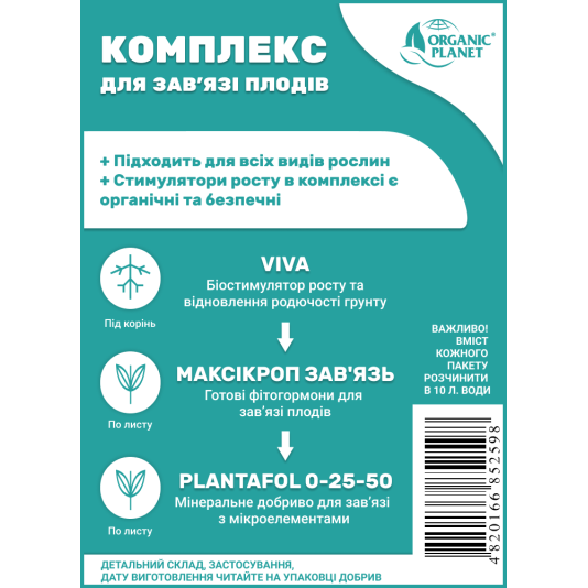Комплекс для зав'язі плодів використовується для всіх видів рослин. Стимулятори росту органічного походження абсолютно безпечні для людини та навколишнього середовища.