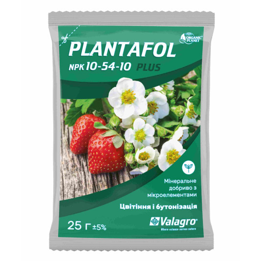 Plantafol 10-54-10, 25 г – високоефективне добриво для листових підживлень, що використовується на ранніх фазах вегетації (для запуску фотосинтезу, росту й розвитку кореневої системи), у випадку стресів (екстремальний рівень рН ґрунту, підвищена вологість або посуха, низькі температури), а також в холодну пору року, при недостатньому засвоєнні елементів живлення з ґрунту. Попереджає дефіцит фосфору, підтримує оптимальний розвиток, бутонізацію, цвітіння і зав’язь, уповільнює процеси старіння, а також відновлює слабке волокнисте коріння.