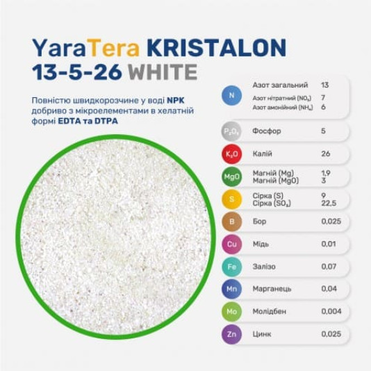 YaraTera Kristalon 13-5-26 White (ЯраТера Крісталон 13-5-26 Білий) - повністю швидкорозчинне у воді NPK добриво з мікроелементами в хелатній формі EDTA. рН 0,1% розчину становить 4,3. Для лужних грунтів. Застосовується протягом репродуктивного періоду. Стандартна формула для стимуляції цвітіння і утворення плодів. Підходить для всіх культур. Ідеальний для декоративних рослин, квітів, овочів та фруктів. Можна застосовувати як у відкритому, так і в закритому грунті для усіх типів зрошувальних систем. Крісталон Білий виготовлений з ретельно відібраниої сировини. Як результат, добриво: - повністю розчинне у воді; - має високий і збалансований вміст макро- і мікроелементів; - вільний від нерозчинних та фітотоксичних сполук; - має дуже низький вміст натрію і хлоридів; - не містить сечовини; - має низьке значення EC. Завдяки високому ступеню автоматизації виробничого процесу в сухому середовищі та суворому контролю якості, Крісталон Білий має відмінні фізичні якості. Готовий продукт: - однорідний; - сипучий; - не утворює пилу; - не злежується; - має свій колір для легкої ідентифікації.