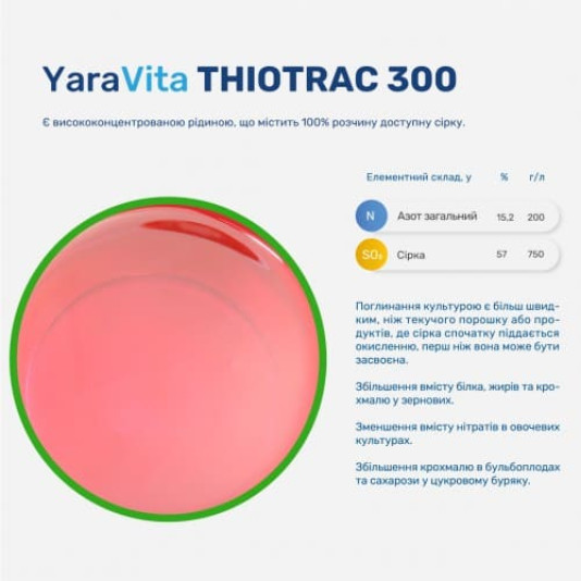 YaraVita THIOTRAC 300 (ЯраВіта Тіотрак 300) є високо концентрованою рідиною, що містить 100% розчинну доступну сірку. Переваги: - Поглинання культурою є більш швидким, ніж текучого порошку або продуктів, де сірка спочатку піддається окисленню, перш ніж вона може бути засвоєна; - Збільшення вмісту білка, жирів та крохмалю у зернівках; - Зменшення вмісту нітратів в овочевих культурах; - Збільшення крохмалю в бульбоплодах та сахарози в цукровому буряку; - Також містить азот, щоб допомогти зберегти важливі співвідношення N:S в рослині; - Контрольований розмір частинок забезпечує швидке поглинання рослинами і тривалий ефект живлення; - Можна застосовувати спільно з багатьма агрохімікатами, дозволяючи легко інтегрувати продукт в програми захисту рослин і позбавитися необхідності у проведенні окремих оприскувань, тим самим заощадивши час і гроші.