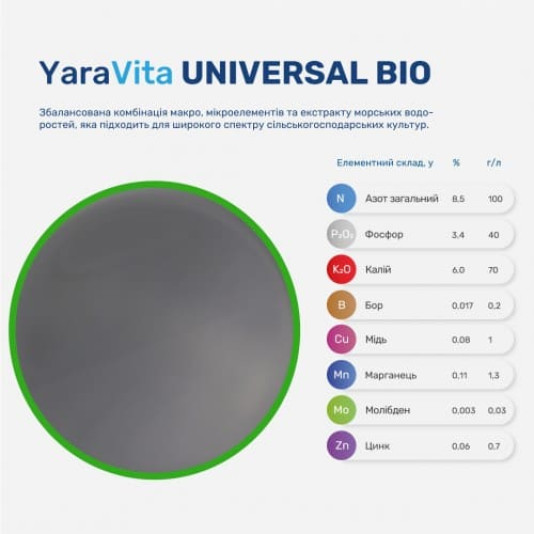 YaraVita UNIVERSAL BIO (ЯраВіта Універсал Біо) – це збалансована комбінація макро, мікроелементів та екстракту морських водоростей, яка підходить для широкого спектру сільськогосподарських культур. Переваги: - Сформульований бути безпечним для використання через регулярні проміжки часу протягом усього періоду вегетації; - Всі поживні речовини, що містяться в YaraVita Universal Bio миттєво доступні для рослин; - Рецептура виробництва надає продукту тривалий ефект підживлення; - Формуляція продукту, дозволяє швидше і простіше його застосовувати, змішувати, обробляти, вимірювати та зберігати; - Продукт містить всі формулянти та прилипачі що посилюють його дію, які присутні у всій лінійці YaraVita; - Можна застосовувати спільно з багатьма агрохімікатами, дозволяючи легко інтегрувати продукт в програми захисту рослин і позбавитися необхідності у проведенні окремих обприскувань, тим самим заощадивши час і гроші; - Містить морські водорості, які пом'якшують дію препаратів, при яких рослини перебувають у стані стресу, зменшує його вплив. ЯраВіта Універсал Біо – містить гіберелін та екстракт морських водоростей.