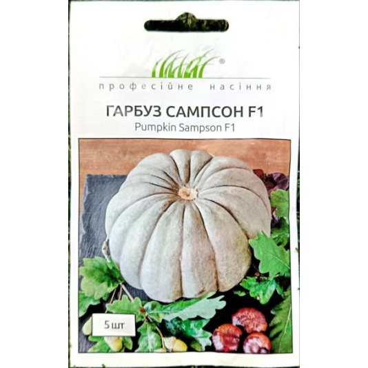 Гарбуз Сампсон F1 - високоврожайний гібрид типу Grey Pumpkin. Потужна рослина з пагонами довжиною від 3,5 м. На кожній рослині утворюється по 2-4 плоди діаметром 30 см і більше. Плоди з малою насіннєвою камерою та насичено-помаранчевим щільним м'якушем. Гібрид вирізняється високими показниками лежкості та транспортабельності. Зберігання плодів до 6 місяців. Призначений для переробки та приготування різноманітних страв.