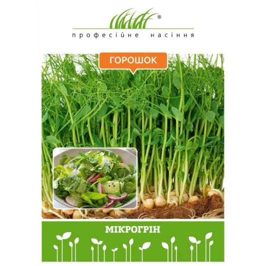 Мікрозелень гороху має зелені молоді листочки, стебла і вусики, поєднує свіжий аромат і хрустку текстуру молодого горошку. На смак вона солодкувата та дуже ніжна, з приємним гороховим ароматом. Мікрозелень - це джерело вітамінів (С, В1, В2, В5, В6, В9), макроелементів (калій, кальцій, магній, натрій, фосфор) та мікроелементів (залізо, марганець, мідь, селен, цинк). Паростки також знижують рівень холестерину в крові, що покращує прохідність судин та сприяє нормалізації артеріального тиску. Використання: як салатну зелень, при приготуванні перших та других страв, а також здорових перекусів (сендвічі, брускети), у смузі та фрешах. Вирощування: посійте насіння на лляний килимок або серветку, добре полийте та накрийте прозорою кришечкою або плівкою. Не забувайте кожен день поливати або оприскувати. Через 7-14 днів збирайте врожай.