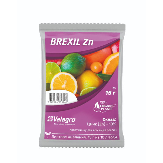 Brexil Zn, 15 г – минеральное удобрение на основе цинка, устраняет симптомы нехватки данного микроэлемента. Дефицит Zn является причиной ухудшения обменных процессов, без него затрудняется синтез ауксинов. Растение также теряет много влаги, его листья деформируются, развивается некроз, происходит обесцвечивание листьев, появление на них характерных пятен и отмерших участков. Зеленая окраска сохраняется только вдоль жилок. Все это является причиной худшего роста, развития культур, как следствие, плохого урожая.