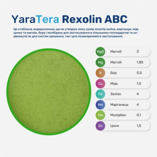 YaraTera REXOLIN ABC (ЯраТера Рексолин АВС) - это стабильная, водорастворимая, не образующая пыли смесь хелатов железа, марганца, меди, цинка и магния, бора и молибдена для применения в сельском хозяйстве и садоводстве как для систем орошения, так и для внекорневого применения. Продукт предназначен для коррекции и профилактики дефицита общих питательных микроэлементов в широком спектре сельскохозяйственных и садовых культур. Преимущества: - Fe, Mn, Cu, Zn в хелатной форме EDTA, этилендиаминтетрауксусной кислоты, кроме магния, бора, молибдена в одной микрогрануле - Разработан для использования и в качестве внекорневых подкормок и для предпосевной обработки семян. - Кроме того, можно использовать при внесении в почву как дополнительный источник микроэлементов для гранулированных NPKS удобрений. - Продукт подвержен фоторазложению, поэтому храните готовый раствор в темноте.