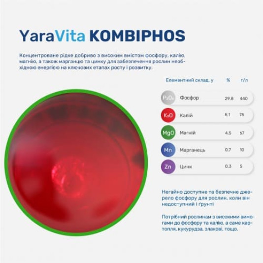 YaraVita KOMBIPHOS (ЯраВита Комбифос) - это концентрированное жидкое удобрение с высоким содержанием фосфора, калия, магния, а также марганца и цинка для обеспечения растений необходимой энергией на ключевых этапах роста и развития. Преимущества: - Немедленно доступный и безопасный источник фосфора для растений, когда он не доступен из почвы; - Способствует активации корневого поглощения; - Нужен растениям с высокими требованиями к фосфору и калию, а именно картофель, кукуруза, злаковые и тому подобное; - Можно применять совместно со многими агрохимикатами, позволяя легко интегрировать продукт в программы защиты растений и избавиться от необходимости в проведении отдельных опрыскиваний, тем самым сэкономив время и деньги.