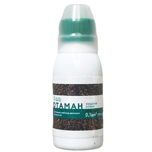 Отаман - системный гербицид-десикант сплошного действия. Преимущества - Высокая эффективность десикации и контроля однолетних и многолетних сорняков - Быстрое действие на сорняки - Длительный защитный период - Низкая себестоимость применения Механизм действия Препарат подавляет белковый синтез в клетках растений, в результате чего происходит ингибирование синтеза хлорофилла с последующим отмиранием растений. Благодаря современному поверхностно-активному веществу гербицид Атаман быстро и эффективно проникает через листья и другие зеленые части растения и разносится по всем органам к корневой системе. Полная гибель наступает через 10-20 дней, в зависимости от погодных условий, вида, стадии развития сорняков и нормы расхода. Сначала наблюдается пожелтение растений, затем листья увядают, растение погибает. Свойства Препарат характеризуется низким уровнем пенообразования при приготовлении рабочего раствора. Это свойство очень актуально при использовании препарата методом малообъемного опрыскивания.